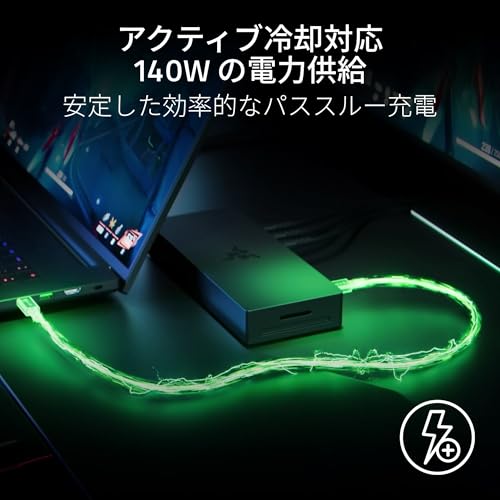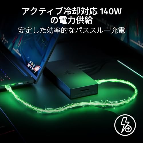 また、250W専用電源アダプターを搭載しており、ノートPCへ最大140Wの高速充電も可能。パワーを必要とするゲーミングノートPCやクリエイター向けノートPCも安心して利用できます。標準モデルは「Razer Chroma RGB」に対応しており、Razer製品らしいライティング演出が可能です。一方ホワイトモデルのRazer Thunderbolt 5 Dock Mercury Whiteは、ライティング機能を省いたシンプルな仕様となっています。