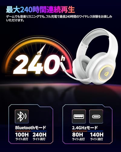 接続モードによって連続使用が異なり、Bluetoothモードではライティングオフで240時間、ライティングオンで100時間。2.4GHzモードではライティングオフで140時間、ライティングオンで80時間となっています。