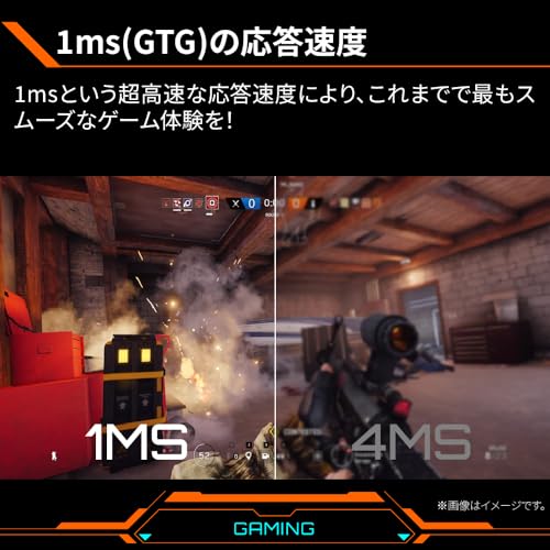 GS27FC2はネイティブ1500Rの曲面パネルを採用。視界を包み込むようなカーブ形状により、FPSやレーシングゲームなど動きの速いタイトルにおいて、高い没入感を実現しています。リフレッシュレートは240Hz、応答速度は1ms(GTG)と高速で、映像の残像感を低減。ゲーム中の素早い動作も滑らかに描写します。